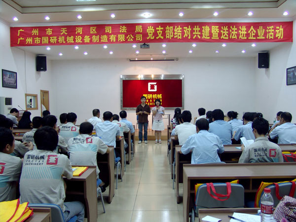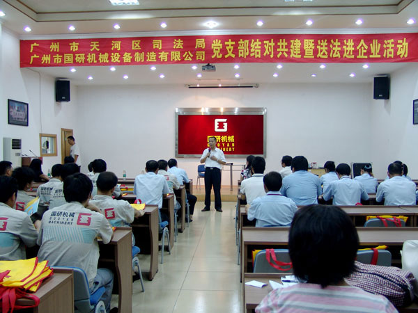9月7日下午,廣州市天河區(qū)司法局黨支部和文教工作隊一行18人在局長羅育輝和副局長曾曉云的帶領(lǐng)下,來到廣州市國研機械設(shè)備制造有限公司舉行黨支部結(jié)對共建暨送法進(jìn)企業(yè)活動。