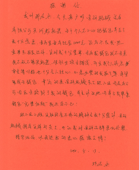 5月13日下午,一封署名為鄧名兵的感謝信送至公司領(lǐng)導(dǎo)手中,信中詳細(xì)描述了公司倉(cāng)管員歐小鳳拾金不昧的感人事跡,請(qǐng)求公司對(duì)歐小鳳進(jìn)行表揚(yáng),并感謝公司培養(yǎng)了歐小鳳這樣的好員工。