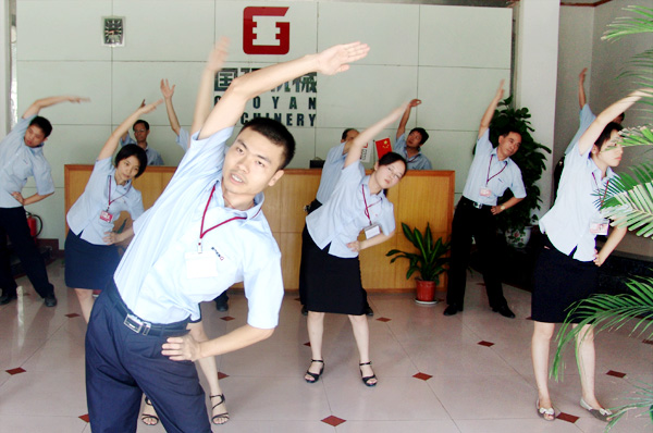 每天早上8:30,隨著公司團(tuán)支部書(shū)記李運(yùn)喜一聲哨響,健身活動(dòng)正式開(kāi)始!全體員工迅速集合,不到兩分鐘,就在健身場(chǎng)地排起了整齊的隊(duì)伍,一個(gè)個(gè)精神抖擻、神采奕奕。體育專業(yè)出身的團(tuán)員青年朱承容,站到隊(duì)伍前列給大家當(dāng)教練。公司高管帶頭參與,大家整齊劃一練起來(lái)。“第一節(jié),頭部運(yùn)動(dòng),一二三四五六七八…… “教練”認(rèn)真,“學(xué)員”用心,整個(gè)健身場(chǎng)面生動(dòng)、氣氛活潑、積極向上。