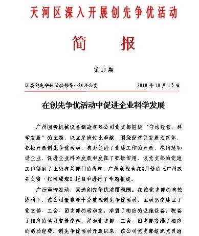 2010年10月13日,天河區(qū)區(qū)委區(qū)政府主辦的工作簡(jiǎn)報(bào)第19期專題報(bào)道了我司黨支部在創(chuàng)先爭(zhēng)優(yōu)活動(dòng)中促進(jìn)企業(yè)科學(xué)發(fā)展的事跡。