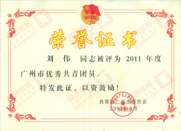 2012年6月,國研機(jī)械公司劉偉同志被共青團(tuán)廣州市委員會評為“2011年度廣州市優(yōu)秀共青團(tuán)員”。